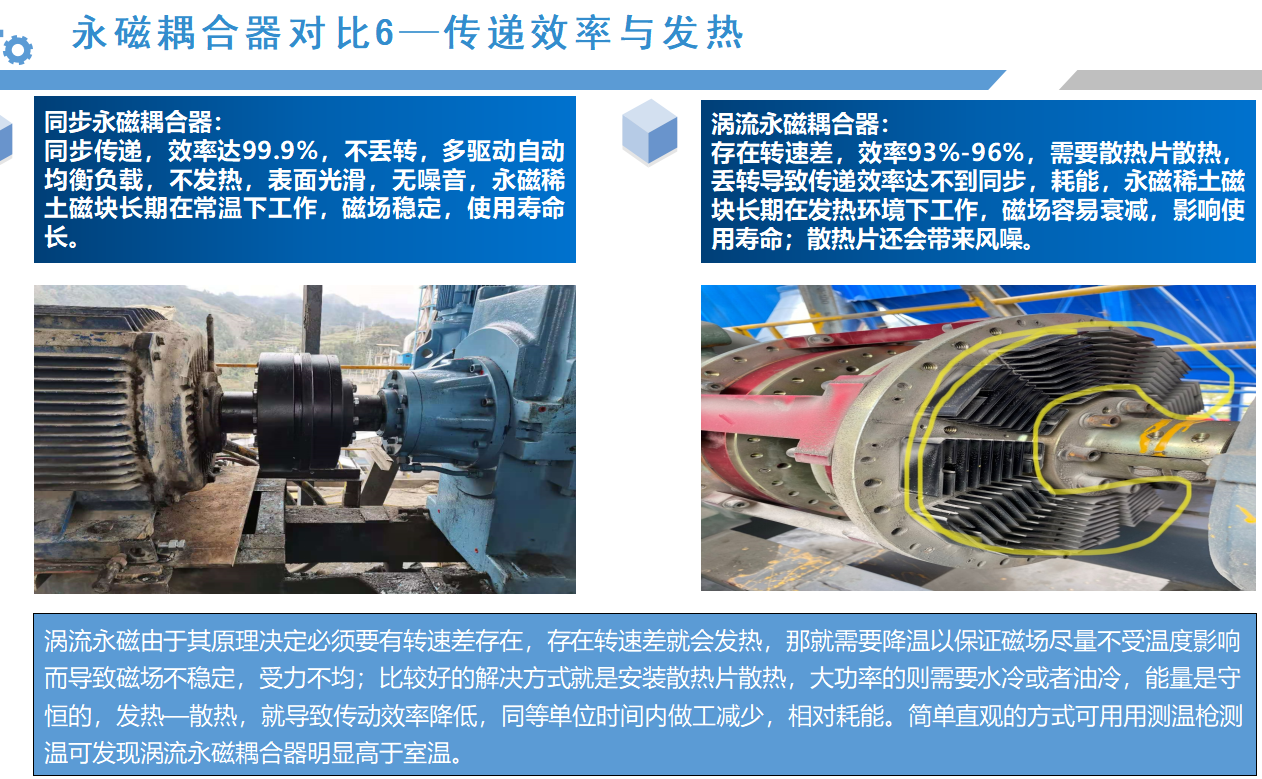 從以上的應用案例來看,同步永磁耦合器的應用效果會比較明顯,接下來,我們通過數據對比的形式,具體分析筒式同步全永磁耦合器與渦流永磁耦合器優劣勢: