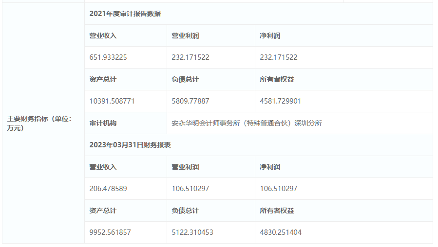 披露信息中提到的企業主要財務指標顯示,2021年度企業利潤總額達232.17萬元,資產總計達1.039億元,當年營業收入651.93萬元,凈利潤232.17萬元,負債總計5809.77887萬元。2023年03月31日財務報表資產總計約9952.561857萬元,營業收入206.478589萬元,凈利潤106.510297萬元,負債總計5122.310453萬元。