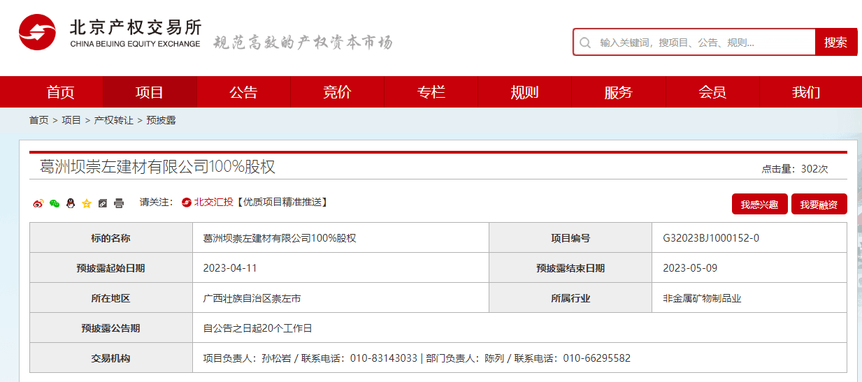 葛洲壩崇左建材有限公司100%股權預掛牌,披露結束日期為2023年5月9日。企業2023年3月31日財務報表顯示,資產總計27936.07萬元,負債總計27836.07萬元,所有者權益100萬元。