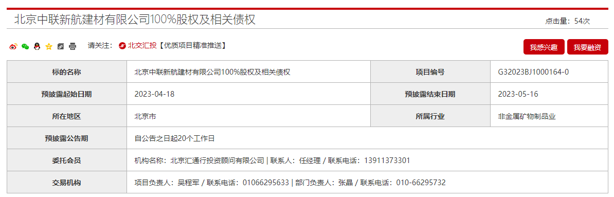中國聯合水泥集團有限公司旗下北京中聯新航建材有限公司100%股權及相關債權擬出讓。企業經營范圍為制造混凝土、預拌砂漿;銷售建筑材料、混凝土添加劑、土砂石、尾礦石、山碎石;技術開發;技術咨詢;機械設備租賃。