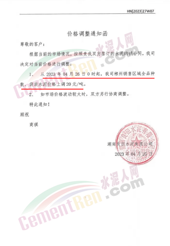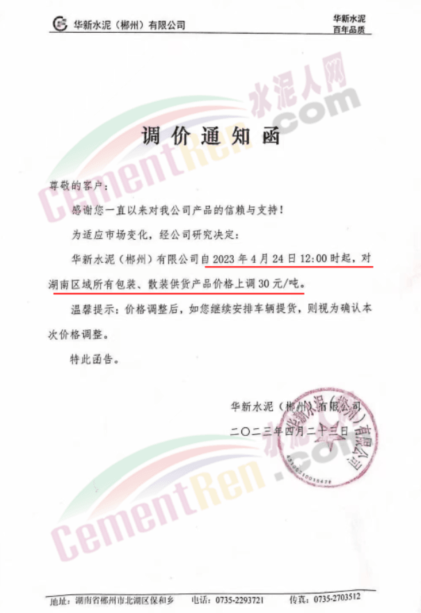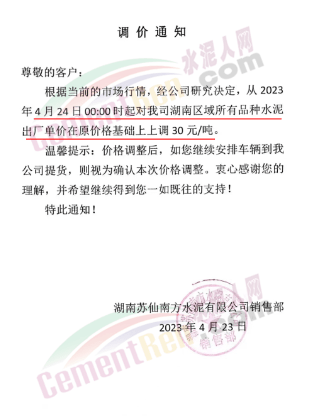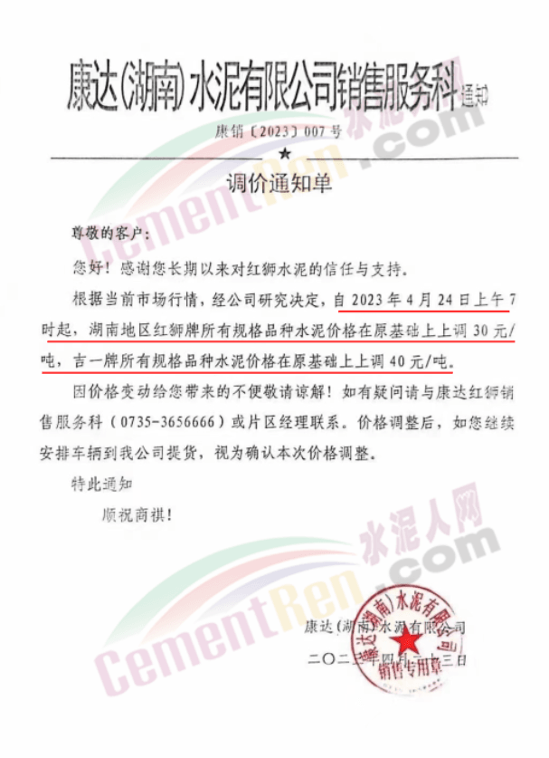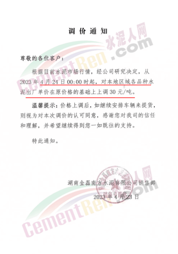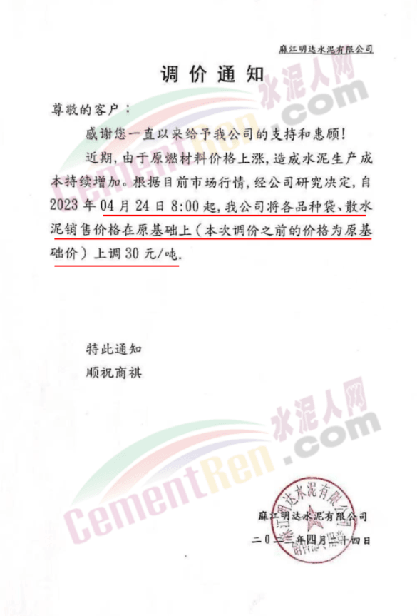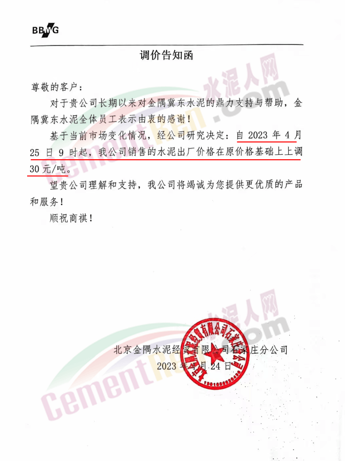 北京金隅水泥經貿有限公司石家莊分公司通知稱,基于當前市場變化情況,經公司研究決定,自2023年4月25日9時起,公司銷售的水泥出廠價格在原價格基礎上上調30元/噸。