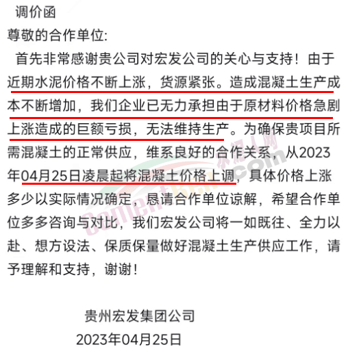 貴州宏發集團公司2023年4月25日發調價函稱,由于近期水泥價格不斷上漲,貨源緊張。造成混凝土生產成本不斷增加,企業已無力承擔由于原材料價格急劇上漲造成的巨額虧損,無法維持生產。為確保項目所需混凝土的正常供應,維系良好的合作關系,從2023年4月25日凌晨起將混凝土價格上調,具體價格上漲多少以實際情況確定。