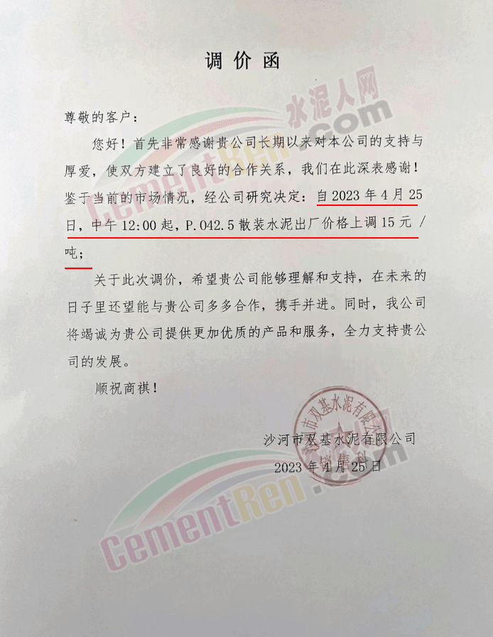 沙河市雙基水泥有限公司通知稱,鑒于當前的市場情況,經公司研究決定:自2023年4月25日,中午12時起,P.042.5散裝水泥出廠價格上調15元/噸。