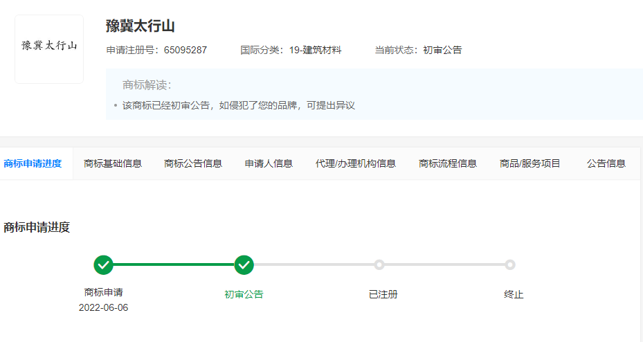 據市場反饋,來自河南安陽區域的兩個品牌在邯鄲武安流通市場也有出現。“豫冀太行山”品牌,申請人為河南省安陽縣益民水泥廠,目前狀態為初審公告階段。