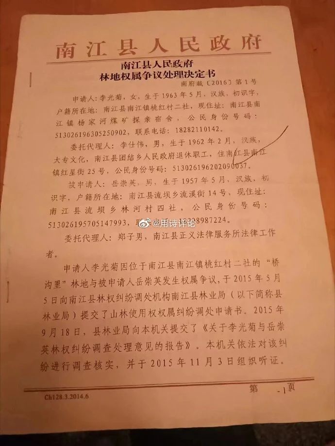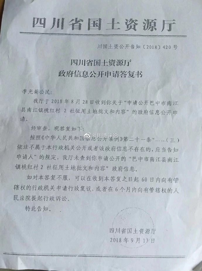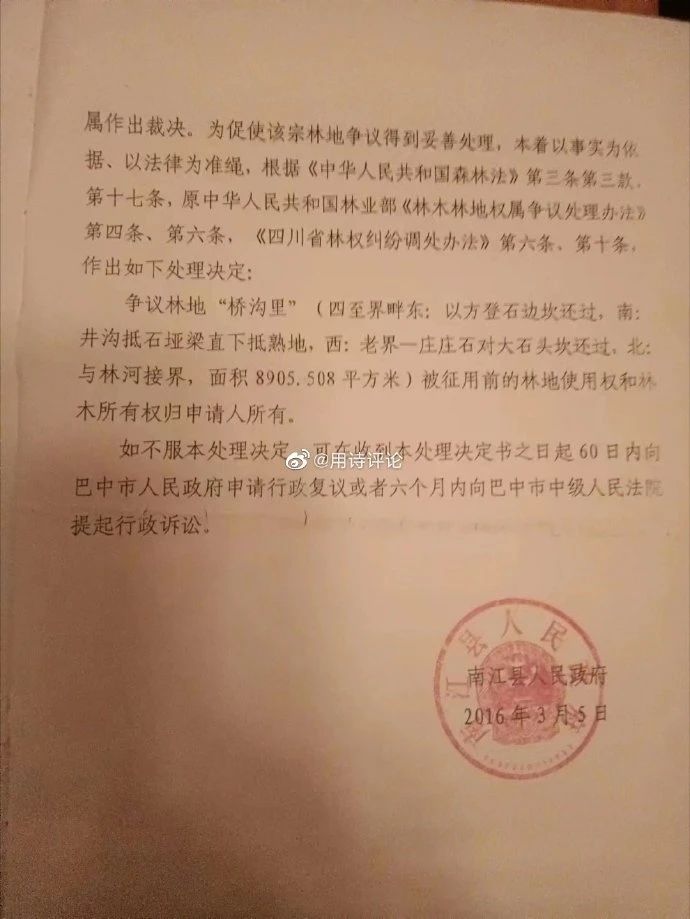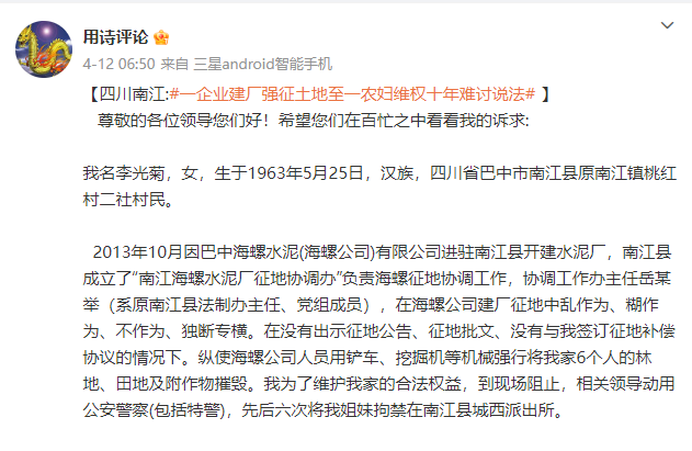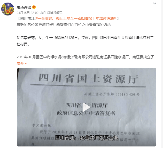 日前,網友“@用詩評論”在社交媒體發布了一則“四川南江一企業建廠強征土地致一農婦維權十年難討說法”的消息。