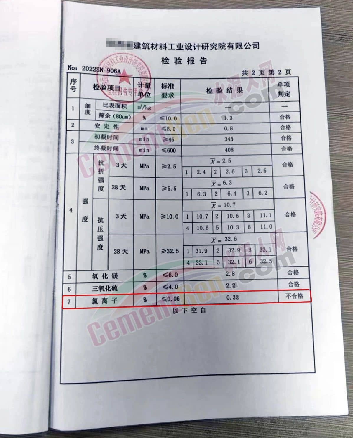 “眾力山水、鶴壁中聯”兩批次水泥“氯離子”不符合標準要求