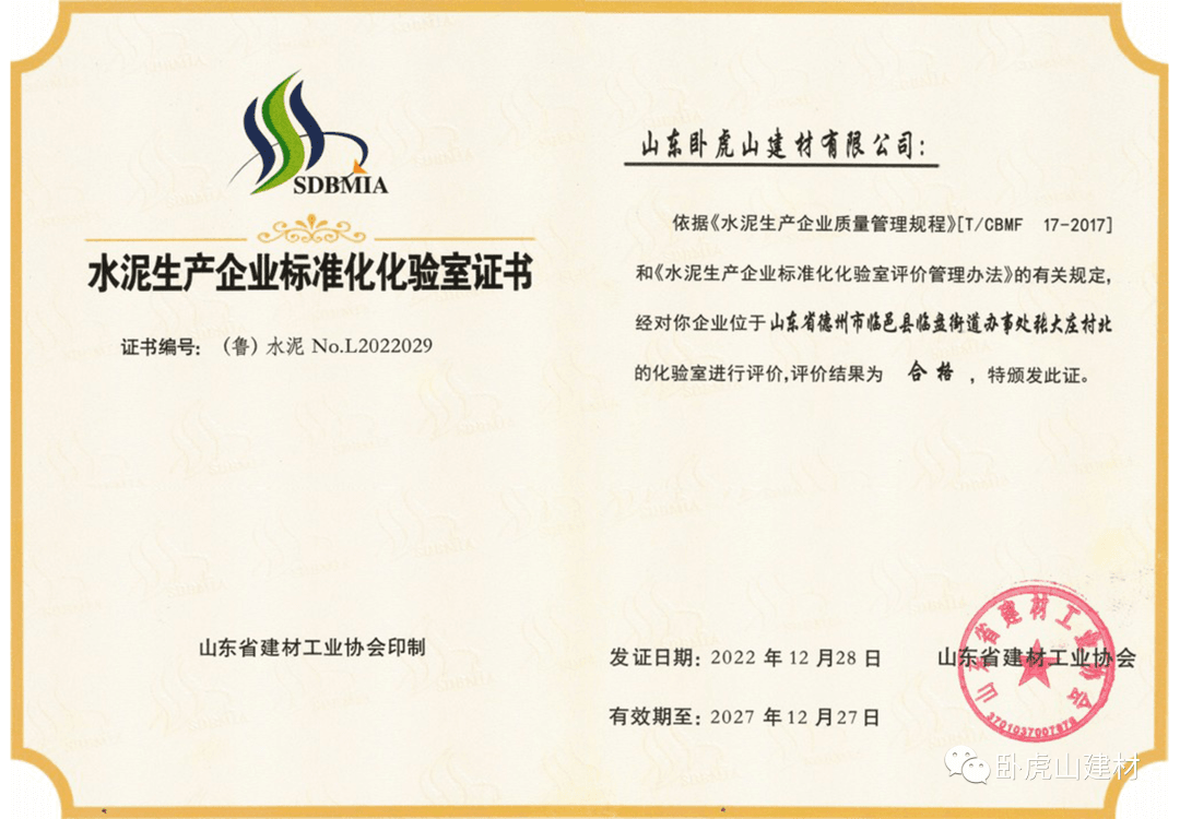 多年來,臥虎山建材出品水泥在省、市化驗室的檢驗結果都是業內佼佼者,憑借強大的技術力量、先進的生產設備、可靠的原料質量和過硬的產品質量,臥虎山建材先后獲得全省水泥生產企業標準化化驗室證書、全省2022年水泥物理檢驗和化學分析大對比全合格單位等榮譽稱號。