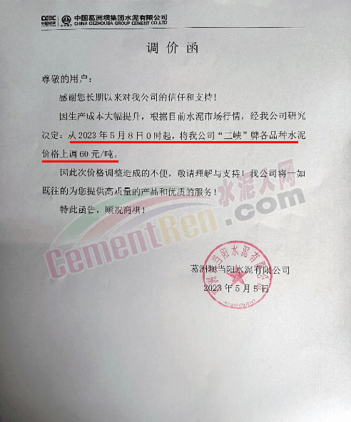 據了解,自年初以來水泥市場波動頻繁,部分區域水泥價格已然觸底。5月5日葛洲壩當陽水泥有限公司通知稱,因生產成本大幅提升,根據目前水泥市場行情,經公司研究決定從2023年5月8日0時起,將公司“三峽”牌各品種水泥價格上調60元/噸。