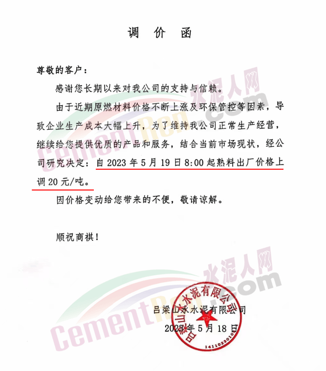 山西晉興奧隆建材有限責任公司銷售公司通知,因近期原材料價格持續上漲、環保投入加大、能耗雙控及錯峰生產等因素,造成公司生產成本增加。根據當前的市場情況,公司自2023年5月19日零時起將熟料價格在現行價格基礎上上調30元/噸。
