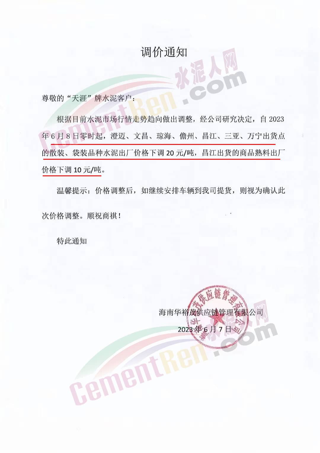 海南華裕茂供應鏈管理有限公司通知,根據目前水泥市場行情走勢趨向做出調整,經公司研究決定,自2023年6月8日零時起,澄邁、文昌、瓊海、儋州、昌江、三亞、萬寧出貨點的散裝、袋裝品種水泥出廠價格下調20元/噸,昌江出貨的商品熟料出廠價格下調10元/噸。