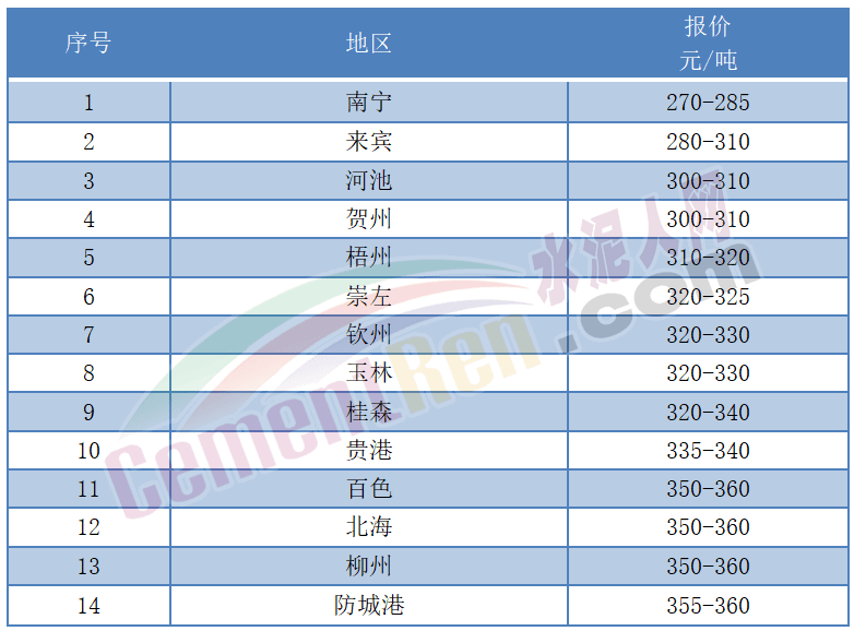 據市場反饋,6月中旬前后,扶綏海螺包裝水泥下調30元/噸,主要輻射崇左、南寧、防城港、北海等區域;北流海螺、興業海螺等通知袋裝水泥下調40元/噸,散裝水泥下調30元/噸,主要輻射玉林、桂林等區域。目前南寧市場P.O42.5散裝水泥報價在270-285元/噸左右。