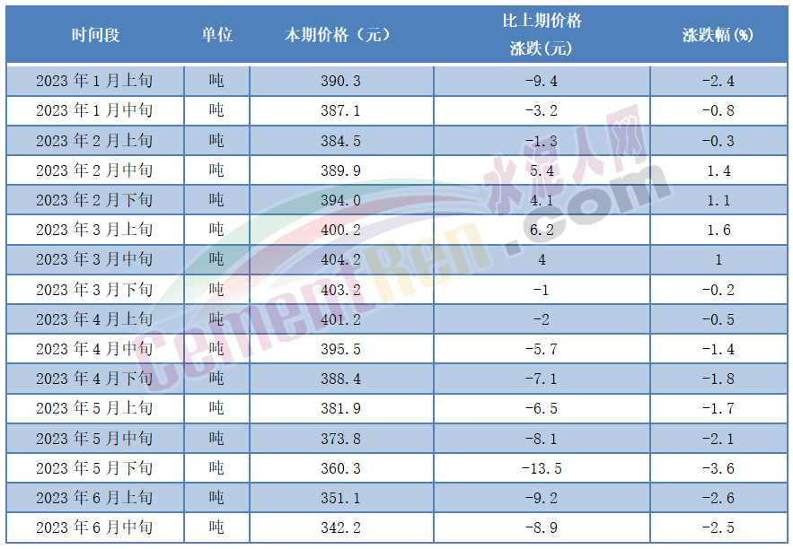 廣西區域某品牌企業銷售負責人表示:淡季市場“全國統一”行情。從國家統計局近日發布的2023年6月中旬流通領域水泥市場價格變動情況可見,雖煤炭價格出現小幅回升,但水泥價格仍持續下跌,P.O42.5散裝水泥較6月上旬下跌8.9元/噸,又一次刷新近五年來的價格最低點。