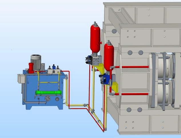 輥壓機在控制上一般采用恒壓力控制或者恒輥縫控制方式。恒壓力控制方式情況下,壓力輸出能保證,但是出現偏輥情況時,易產生內漏,導致運行不穩效率低下;恒輥縫控制方式情況下,雖然過程中系統維持輥縫平衡進行糾偏,易出現兩側壓力偏差過大而失去了有效推力,同樣導致運行不穩效率低下。輥壓機SPC液控系統可完美解決以上問題,該系統基于輥壓機分段式有效功率控制,在輥壓機出現以上狀況時能自動控制輥壓機出力、保證有效功率的發揮,從而提高其運行效率。