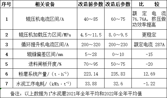在相同的質量控制指標前提下,輥壓機改造后的聯合粉磨系統產量由223.14t/h提高至235.83t/h,增產幅度12.69%。粉磨電耗由33.88kWh/t降至32.6kWh/t,電耗降低了1.22 kWh/t實現清潔生產;