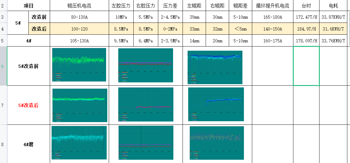 例: 水泥粉磨生產線,均為160-140輥壓機+Φ4.8m×9.5m管磨機組成的聯合粉磨系統。改造前,輥壓機動定輥運行電流大多時間在95A以下,兩側壓力差大,輥縫偏差大時達到18mm,系統粉磨電耗高,產量低。分析認為,根本原因出在輥壓機系統,表現為輥壓機喂料裝置喂料不穩定,液壓系統和電氣控制的功能發揮存在不足。