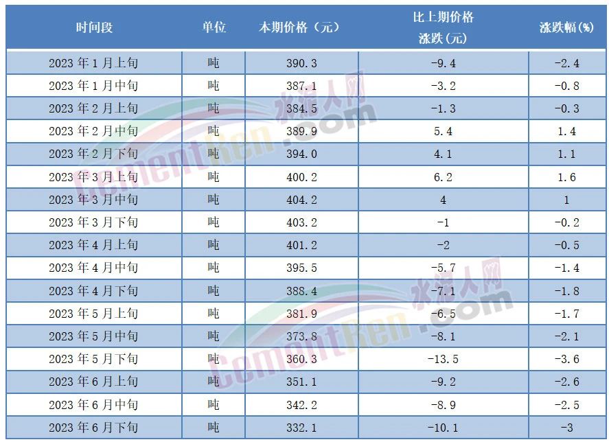 7月4日,國家統計局發布2023年6月下旬流通領域重要生產資料市場價格變動情況,其中P.O42.5散裝水泥報價332.1元/噸,環比6月中旬下跌10.1元/噸,跌幅3%。