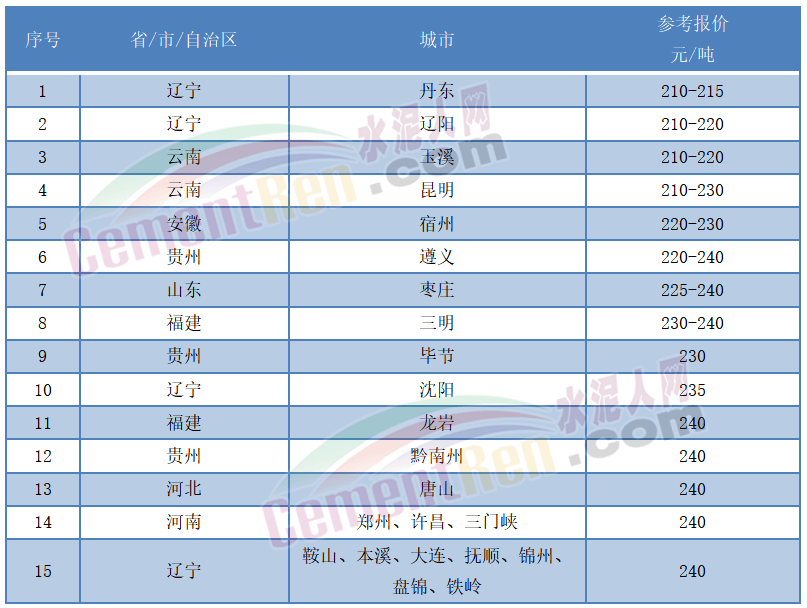 備注:上述數據來源水泥人網信息中心人工采集,僅供參考,如與實際成交價格不符,請以實際成交為準。