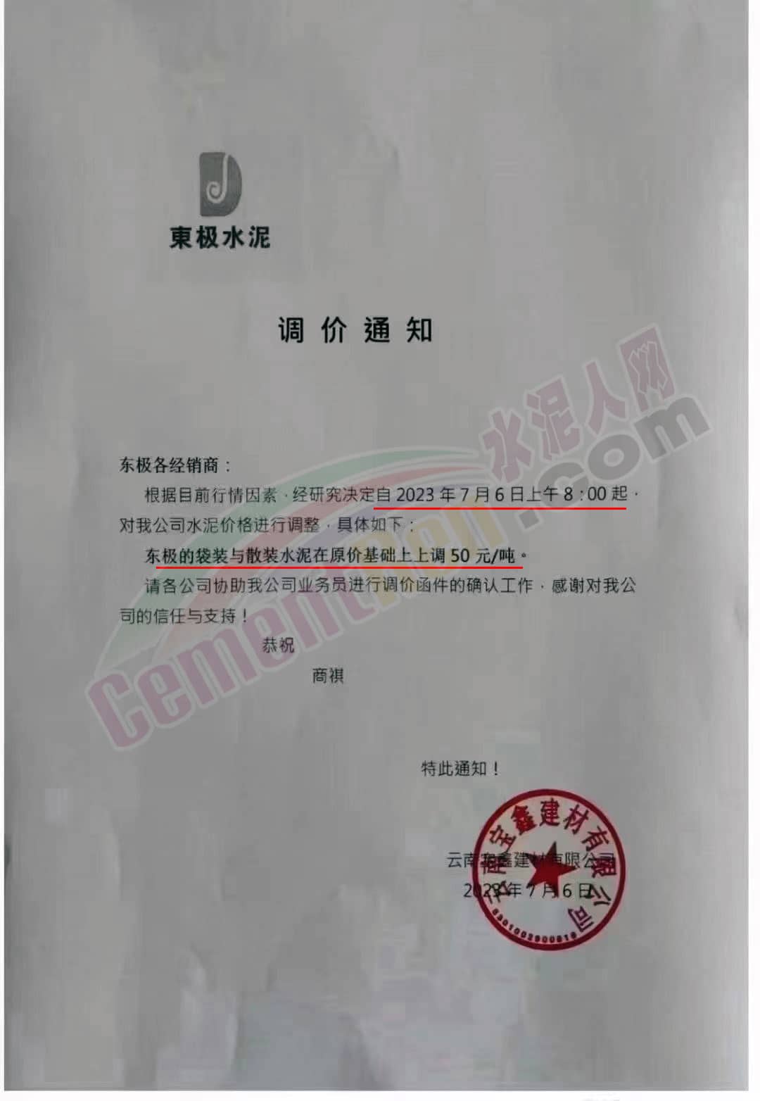 云南宜良西南水泥有限公司通知,因原材料價格上漲,導致公司生產成本增加,經研究決定:于2023年7月6日8時起,對所有區域所有品種水泥在原價格基礎上上調50元/噸。