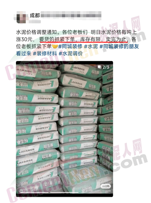 另有成都經銷商通知:每噸漲30元,每包漲約1.5元,要貨的抓緊下單,庫存有限,賣完為止……
