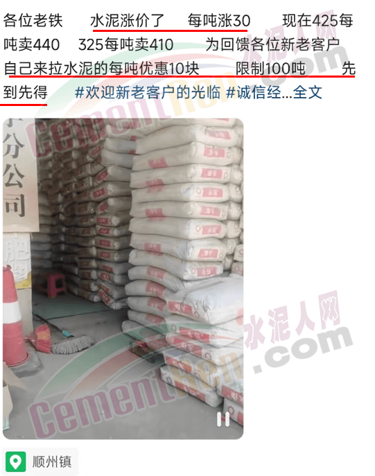 同期,云南省麗江市永勝縣順州鎮一經銷商發通知稱,水泥每噸漲30元,42.5報價440元/噸,32.5報價410元/噸,為回饋客戶,自己來拉水泥優惠10元/噸,限量100噸,先到先得。