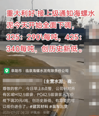 日前,安徽阜陽一貿易商通知:“臨泉海螺通知公司針對所有區域M32.5級袋、PO42.5級袋裝水泥價格下調20元/噸,創歷史新低,有需要的可以低價進倉了 ”。本輪調價后,臨泉海螺M32.5袋裝水泥報價290元/噸,P.O425級袋裝水泥報價340元/噸。