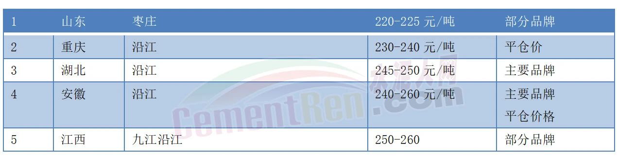 熟料價格方面山東棗莊及重慶、湖北、安徽、江西沿江熟料報價多在220-260元/噸之間。