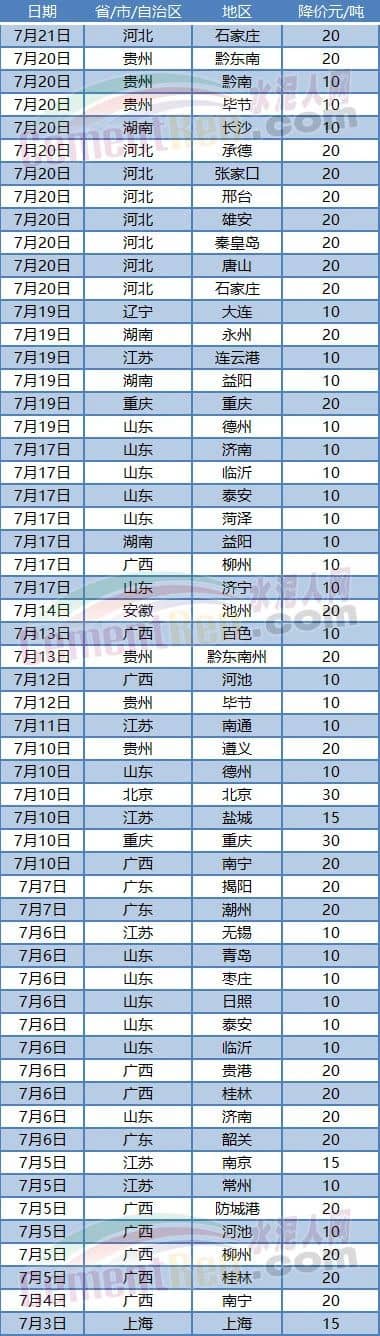 另據了解,在管理費用,技改支出增加,但市場價格卻跌跌不休的情況下,有部分企業已在虧本銷售。盡管如此,市場降價信息仍不斷涌來。7月份以來河北、河南、山東、廣東、廣西、江蘇、安徽、湖南、遼寧、重慶、貴州等10多個區域水泥價格仍處于下行態勢。