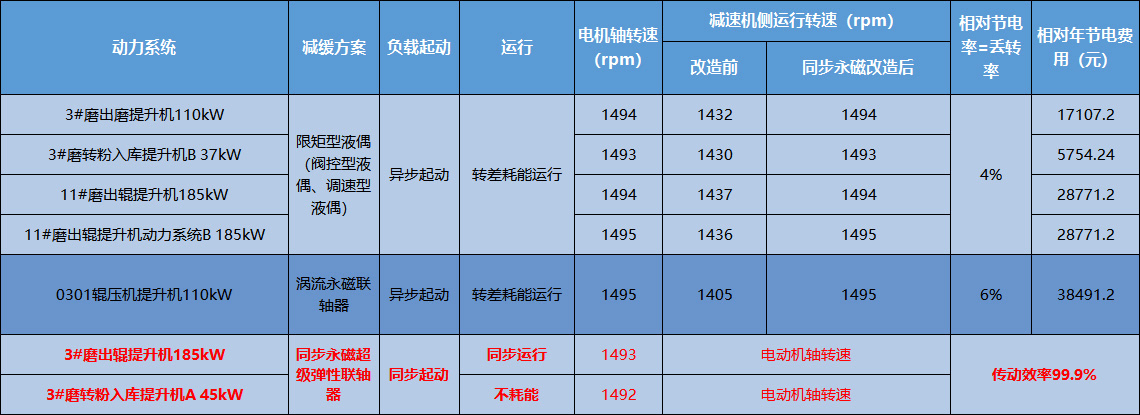 河南錦榮水泥各動力系統采用同步永磁超級彈性聯軸器改造后節電效果亦十分顯著:
