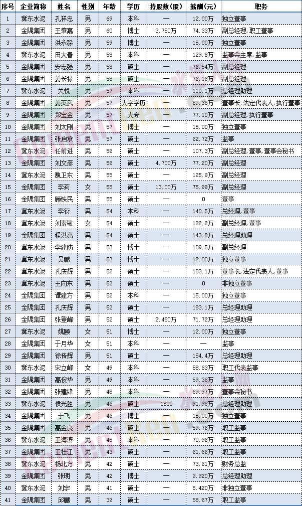 祁連山水泥總裁劉繼彬、海螺水泥副董事長王建超;華新水泥總裁李葉青;尖峰集團董事長蔣曉萌、西部水泥總工程師王建禮;亞泰集團董事翟懷宇在內的18位上市公司高管為1964年生人,今年59歲。