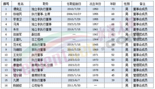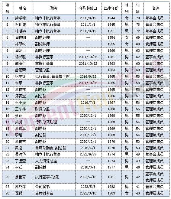 中國建材董事會成員及管理層成員中包括執行總裁肖家祥,非執行董事李新華在內的多位高管年齡處于59-60歲之間。