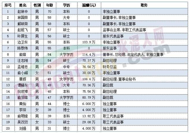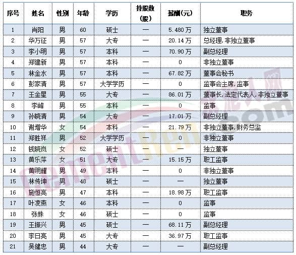 福建水泥獨立董事肖陽今年60歲,總經理華萬征,副總經理李小明,董事會秘書林金水以及監事會主席彭家清今年都是57歲。