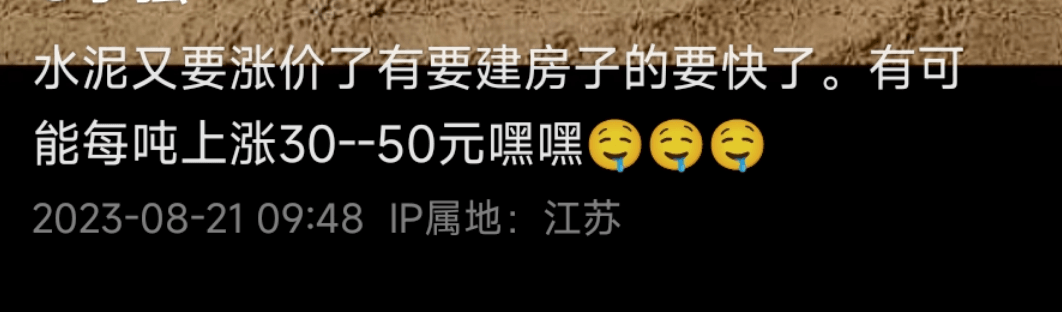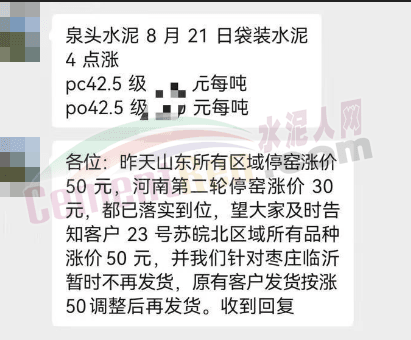 據市場反饋,8月20日棗莊中聯、華沃已上調報價30元/噸;21日濟寧海螺上調30元/噸。22日-23日蘇北徐州中聯水泥、龍山水泥將上調報價。江蘇徐州一經銷商通知稱,水泥又要漲價了,有建房子要快下手了,預計上漲30~50元/噸。