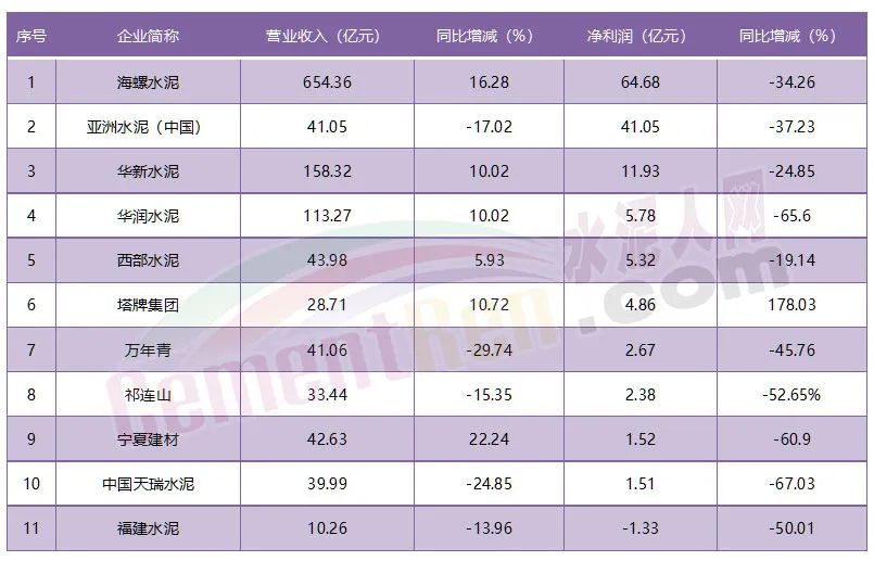 海螺水泥、亞洲水泥、華新水泥、華潤水泥、西部水泥、萬年青寧、祁連山、寧夏建材、天瑞水泥等9家企業凈利潤等均有不同程度的下滑;福建水泥虧損1.33億。