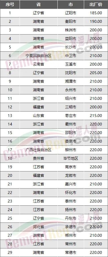 全國PO42.5散裝水泥價格最低的前10個省市為遼寧省、湖南省、福建省、云南省、浙江省、寧夏回族自治區、山東省、廣西壯族自治區、貴州省、江蘇省、河北省,P.O42.5散裝水泥出廠報價均在220元/噸以下。