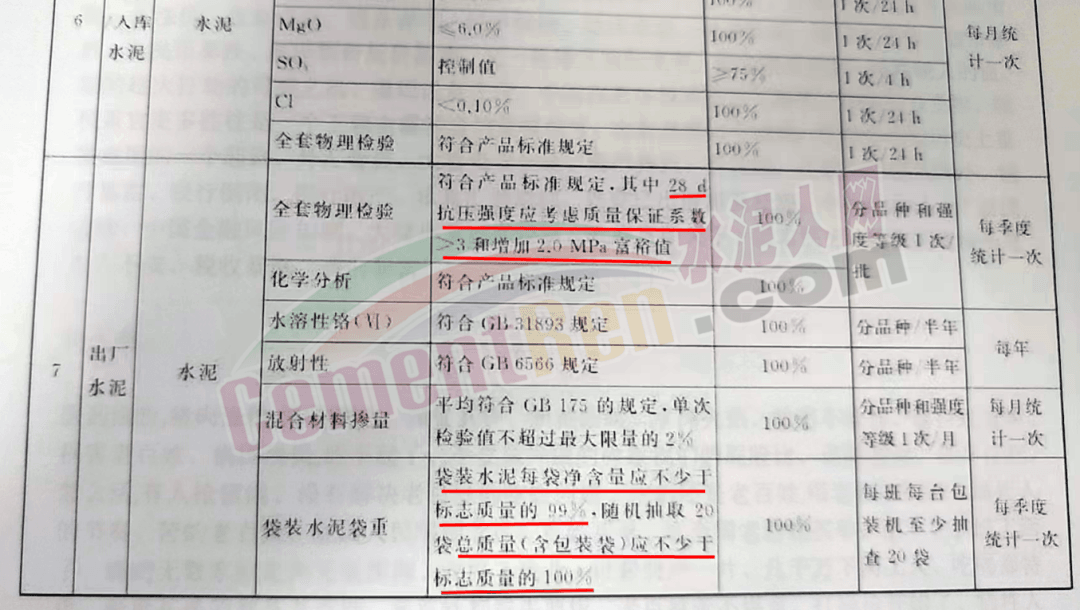 全套物理檢驗項目指標要求,除符合產品標準規定外,28天抗壓強度應考慮質量保證系統大于3和增加2Mpa富余值。同時要求袋裝水泥每袋凈含量不少于標稱質量的99%。
