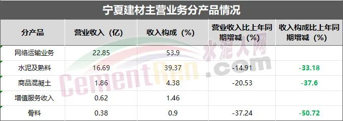 水泥人網從寧夏建材上半年財報中獲悉,今年上半年,寧夏建材網絡運輸業務營業收入22.85億,已占主營業務收入的53.9%,遠遠大于水泥及熟料、商品混凝土、骨料等其他業務板塊營業收入。截止2023年6月30日,寧夏建材“我找車”數字物流平臺累計注冊車輛133萬輛。因業務推廣力度加大,賽馬物聯實現營業收入25.57億元,同比增加87.34%。