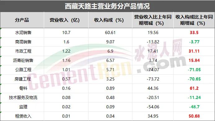 截止2023年上半年,西藏天路水泥銷售營業收入同比去年增加19.56%,收入構成同比去年增加33.5%;骨料營業收入同比去年增加44.36%,收入構成同比去年增加61.2%。