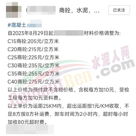 山東一家商砼站通知,自8月29日起調整材料價格。并提示報價為預付款不含稅價格,含稅每方再加10元,受檢工程每方再加10元資料費。單價為運距25公里內,超出運距按1元/公里收取,卸車時間為2小時內,超時每小時加收80元超時費。