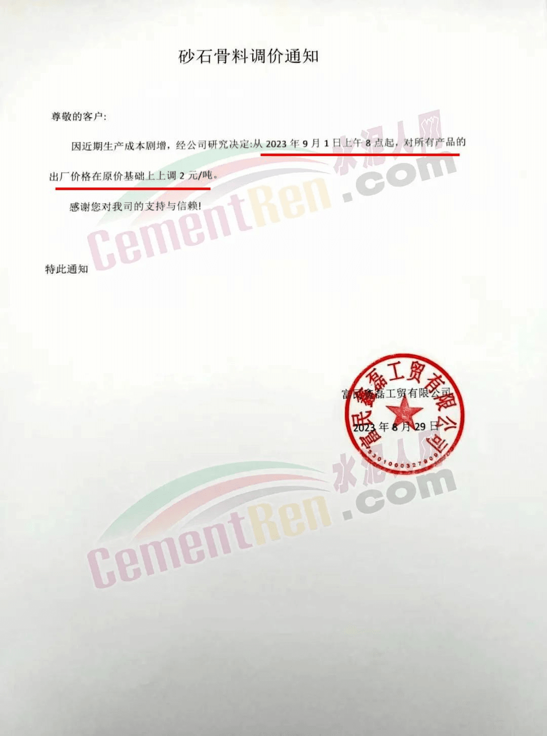 華新水泥(富民)有限公司通知稱,受電力供應緊張、環保投資及資源稅等影響,導致生產成本大幅度增加,經公司慎重研究決定:自2023年9月1日8時起,公司所有品種骨料出廠價在原執行價格基礎上上調2元/噸。
