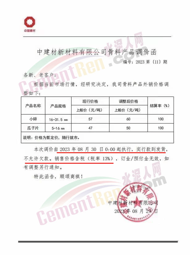 中建材新材料有限公司通知,根據當前市場行情經研究決定,公司骨料產品小碎16-31.5mt及瓜子片5-16m外銷價格,自8月30日0時起上調3元/噸。實行款到發貨,不允許欠款。銷售價格含稅(稅率13%),訂金/預付金無效。