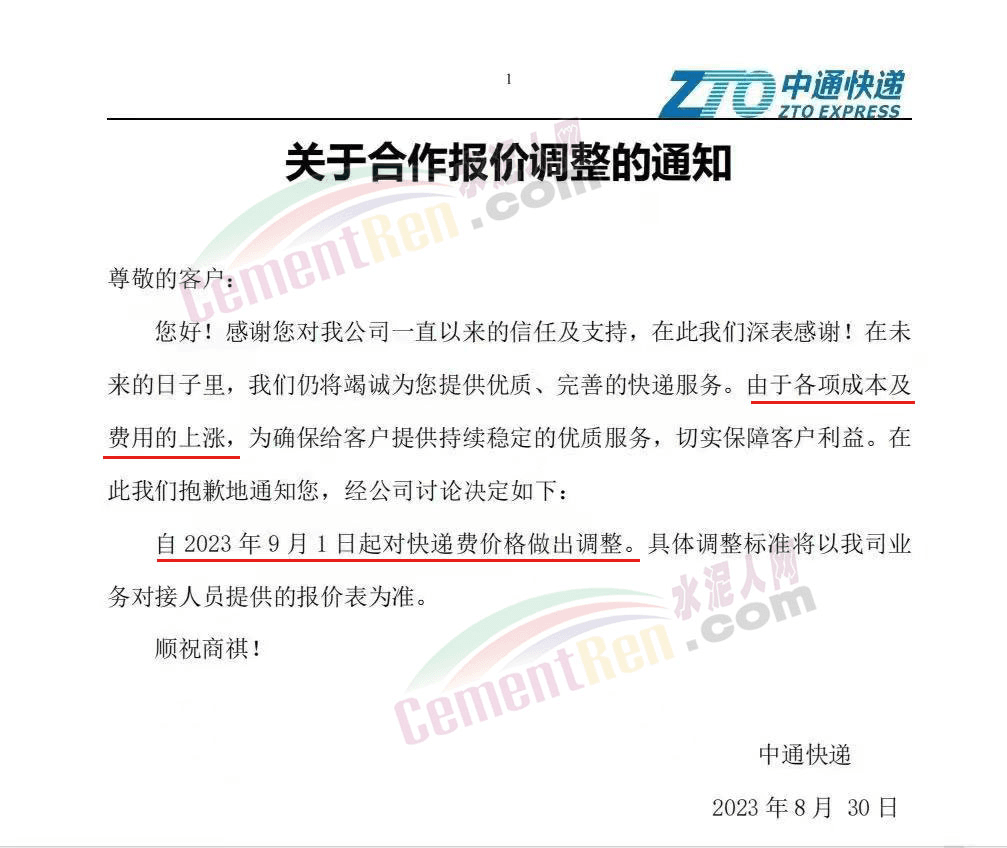 中通快遞通知,由于各項成本及費用的上漲,為確保給客戶提供持續穩定的優質服務,切實保障客戶利益。經公司討論決定自2023年9月1日起對快遞費價格作出調整。