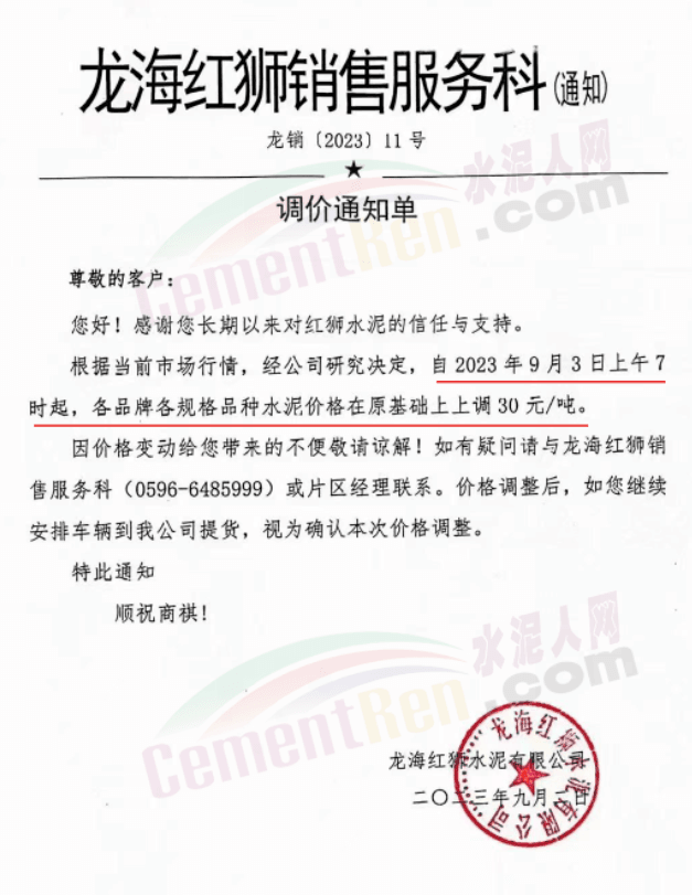 紅獅水泥旗下漳州紫金水泥、龍海紅獅、大田紅獅銷售服務科通知,根據當前市場行情,經公司研究決定,自2023年9月3日上午7時起,各品牌各規格品種水泥價格在原基礎上上調30元/噸。