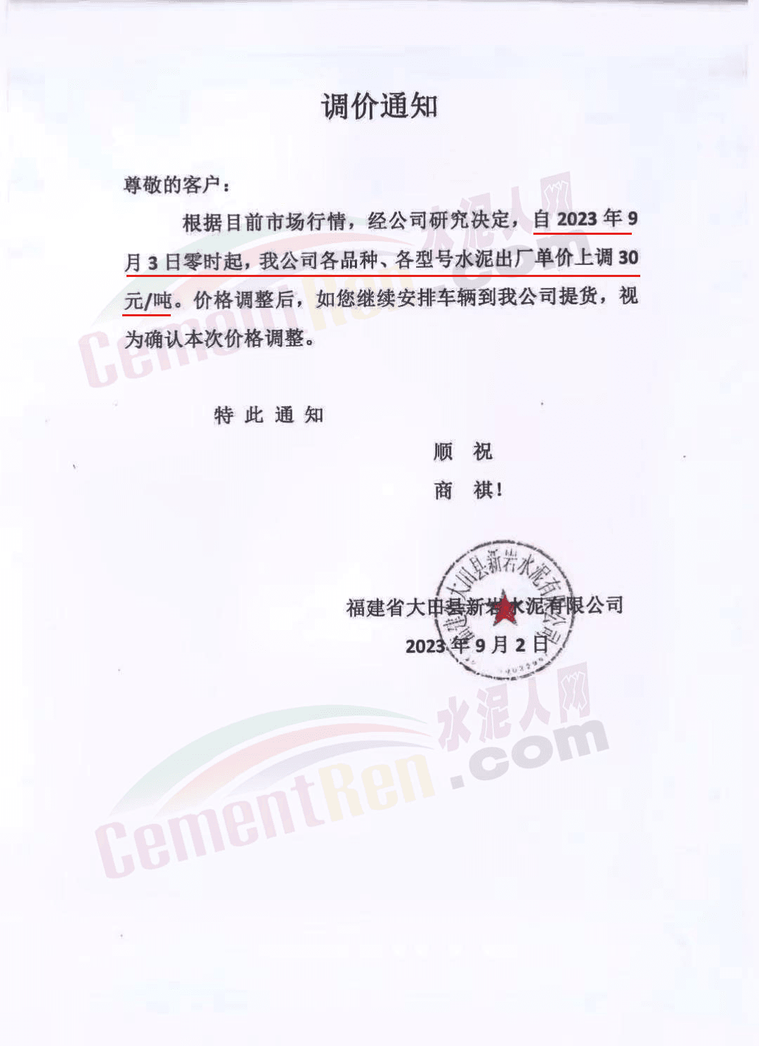 福建省大田新巖水泥有限公司通知,根據目前市場行情,經公司研究決定,自2023年9月3日0時起,公司各品種、各型號水泥出廠單價上調30元/噸。