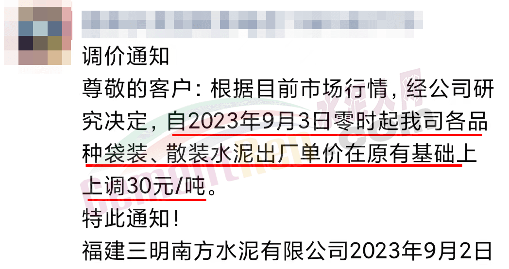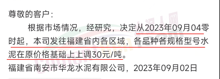 福建龍麟集團有限公司通知,根據目前市場行情及受原材料物流價格影響,經公司研究決定:自2023年9月3日0時起,公司發往福建省內各區域各規格型號散裝、袋裝水泥出廠價格在原價格基礎上上調30元/噸。