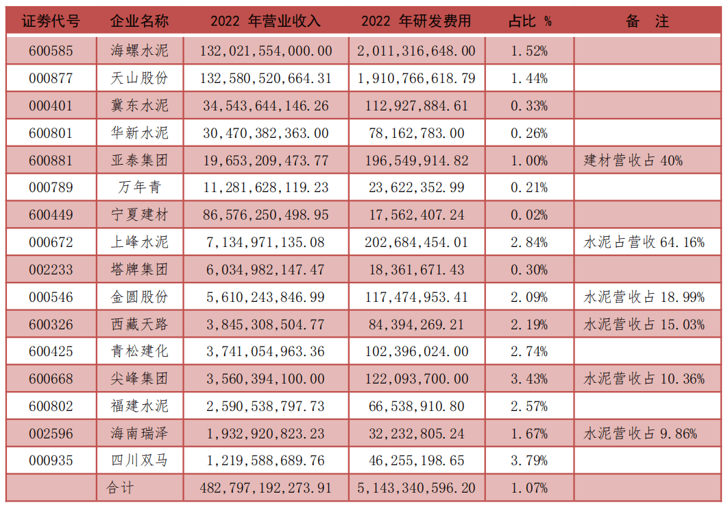 表4 部分水泥上市公司2022年度企業研發費占比數據
