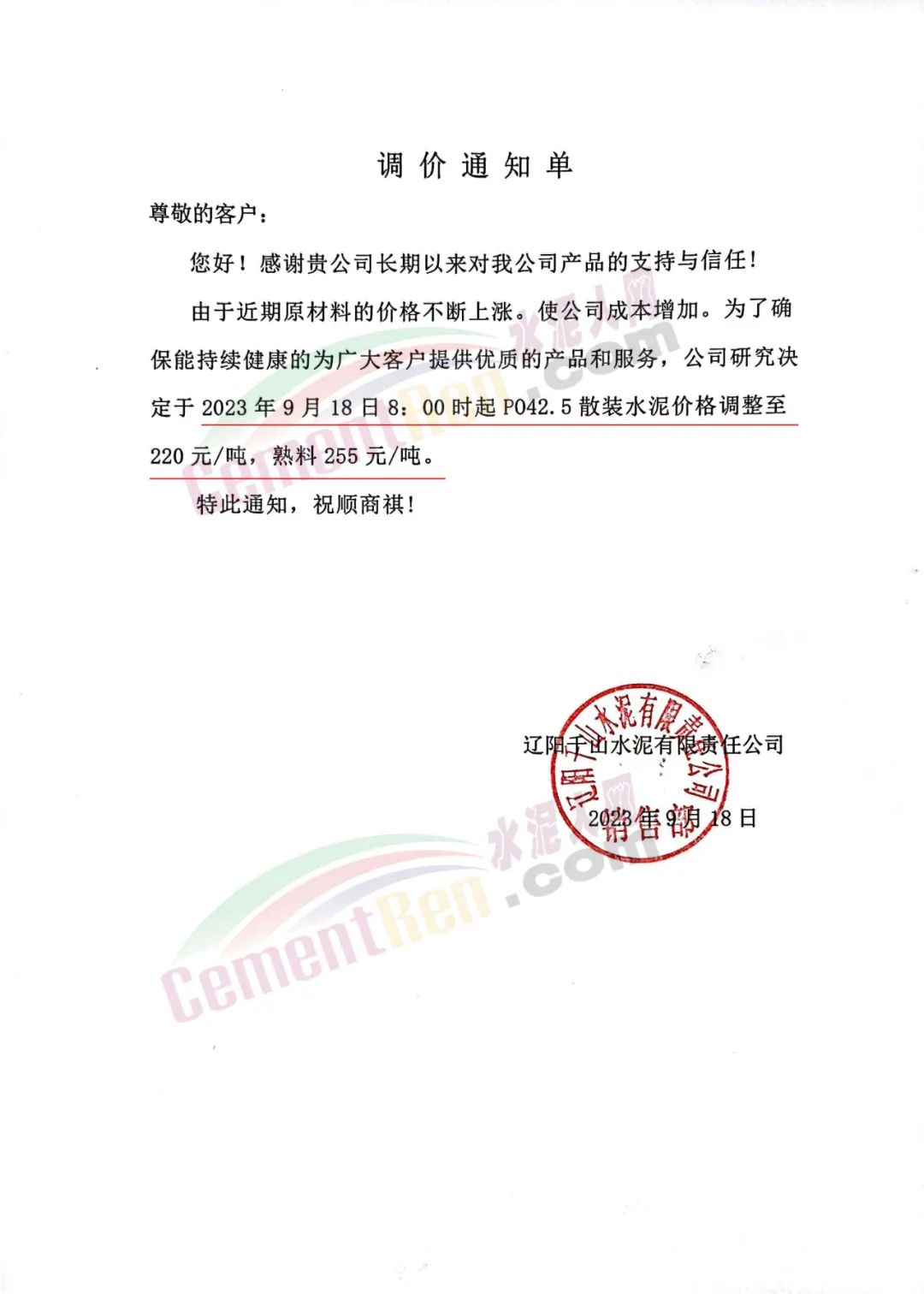 遼陽千山水泥有限責任公司通知,由于近期原材料的價格不斷上漲。使公司成本增加。為了確保能持續健康的為廣大客戶提供優質的產品和服務,公司研究決定于2023年9月18日8:00時起PO425散裝水泥價格調整至220元/噸,熟料255元/噸。
