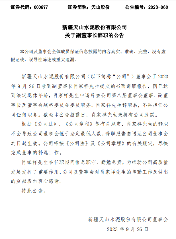 天山股份9月26日晚間發布公告稱,新疆天山水泥股份有限公司董事會于2023年9月26日收到副董事長肖家祥先生提交的書面辭職報告,因已達到法定退休年齡,肖家祥先生申請辭去公司第八屆董事會董事、副董事長及董事會戰略委員會委員職務,不再擔任公司任何職務。