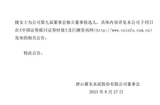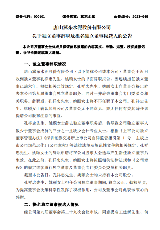 冀東水泥獨立董事孔祥忠先生、姚頤女士辭職,王建新先生、何捷女士將接任