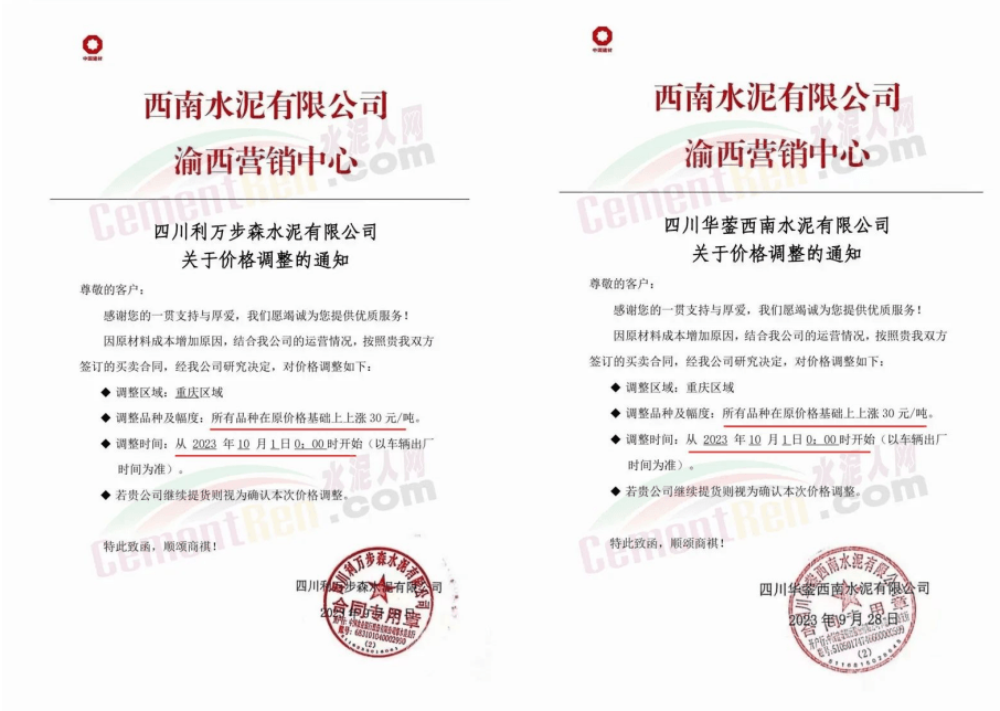 10月1日重慶金隅冀東、華新水泥、紅獅水泥、西南水泥渝西營銷中心等主要品牌企業通知,上調水泥價格30元/噸。