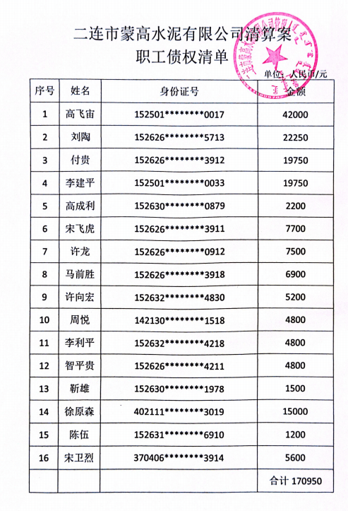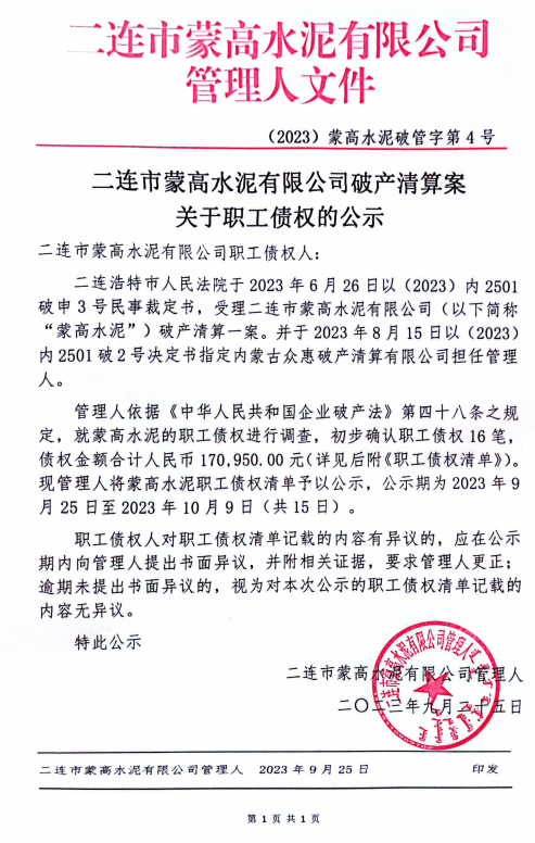 二連市蒙高水泥有限公司破產,管理人初步確認職工債權16筆債權金額合計人民幣170,950.00元。